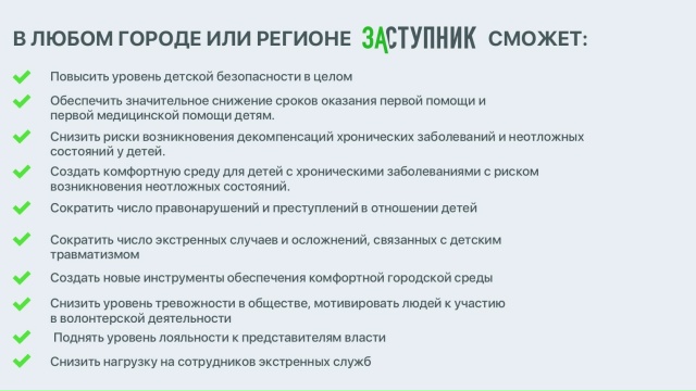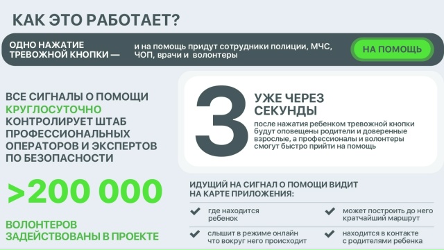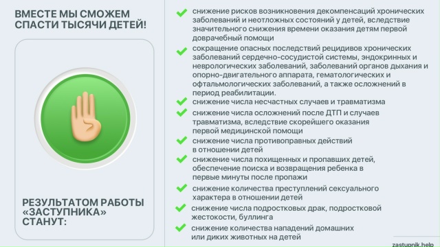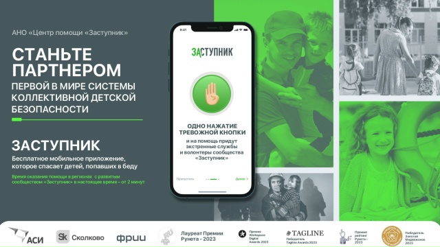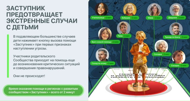 Если у ребёнка участника Сообщества случится беда, он сможет воспользоваться кнопкой вызова помощи в бесплатном мобильном приложении «Заступник» и передать операторам ситуационного центра «Заступник», экстренным службам и другим участникам Сообщества, находящимся вблизи места ЧП, информацию о месте и характере угрозы. Получившие вызов верифицированные участники Сообщества, с разрешения и под контролем родителей ребенка, смогут оперативно оказать первую помощь до прибытия экстренных служб.